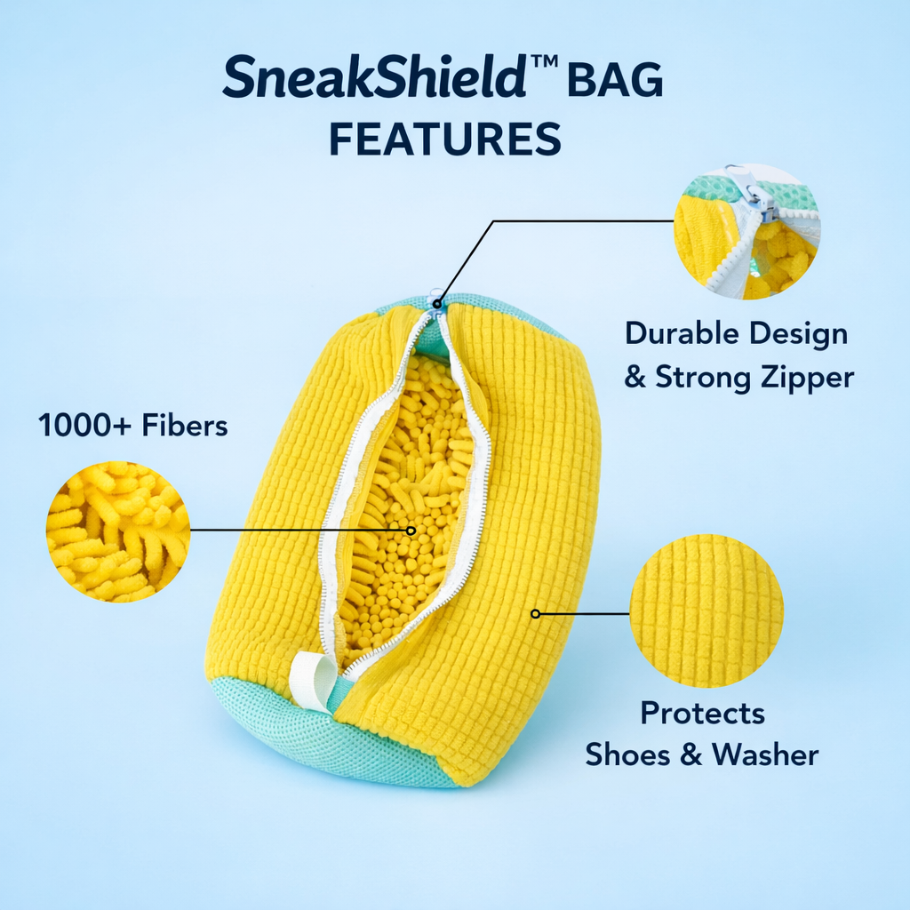 Simply place your shoes inside the SneakShield™ bag, zip it securely closed, and toss it in your washing machine with your regular detergent. The protective mesh allows water and soap to penetrate while keeping your shoes cushioned and protected. Remove after the cycle, air dry, and enjoy fresh, clean sneakers!